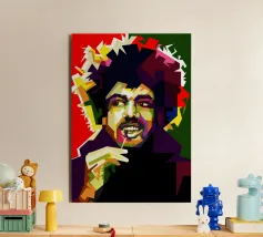 Un vibrante ritratto in stile WPAP di Bob Ross, l'amato pittore noto per la sua voce calma e i suoi "alberelli felici". Questa opera d'arte reimmagina Ross con audaci forme geometriche e colori vivaci, catturando i suoi iconici capelli afro, il suo sorriso sereno e il suo spirito artistico in una moderna estetica pop-art.