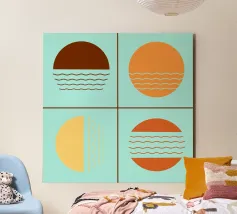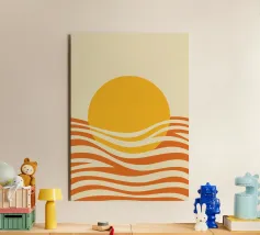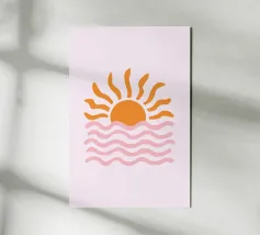 Questo disegno astratto presenta un audace sole a semicerchio marrone che tramonta su dolci linee ondulate su un morbido sfondo color acqua, incorniciato da un bordo coordinato. La composizione minimalista ma di grande effetto evoca serate tranquille in spiaggia e uno stile boho retrò, rendendolo un accento perfetto per chi apprezza la semplicità, la natura e l'estetica di ispirazione vintage. Ideale per aggiungere un'atmosfera calda e tranquilla a qualsiasi spazio o collezione.