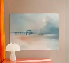 Questo disegno astratto presenta un audace sole a semicerchio marrone che tramonta su dolci linee ondulate su un morbido sfondo color acqua, incorniciato da un bordo coordinato. La composizione minimalista ma di grande effetto evoca serate tranquille in spiaggia e uno stile boho retrò, rendendolo un accento perfetto per chi apprezza la semplicità, la natura e l'estetica di ispirazione vintage. Ideale per aggiungere un'atmosfera calda e tranquilla a qualsiasi spazio o collezione.