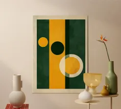 Ispirata all'estetica moderna del Bauhaus e della metà del secolo scorso, questa opera d'arte presenta audaci blocchi geometrici in giallo, verde, blu, nero e bianco sporco. Le sue linee pulite e i forti contrasti catturano l'armonia senza tempo del design modernista.