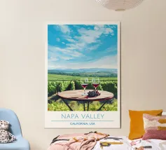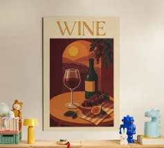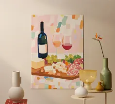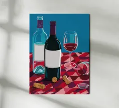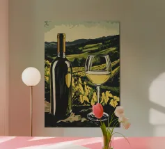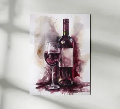 Due bottiglie di vino, un bicchiere di vino rosso e uva fresca su uno sfondo di foglie di vite verdi: questa classica natura morta è un omaggio al piacere, all'artigianato e alla natura. I colori tenui e la rappresentazione realistica rendono il motivo particolarmente adatto a cucine, sale da pranzo o cantine. Ideale per gli amanti del vino, i sommelier o come regalo per gli intenditori.
