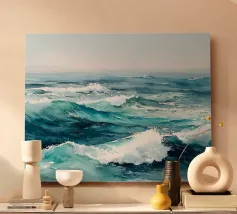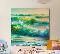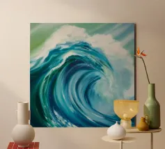 Quest'onda oceanica si alza e si arriccia con un movimento ampio e scultoreo. La pennellata strutturata conferisce alla superficie una qualità quasi pittorica, mentre i gradienti blu vividi si infrangono in una schiuma luminosa. Una stampa perfetta per case al mare, bagni o interni moderni che desiderano energia, movimento e calma da acqua salata.