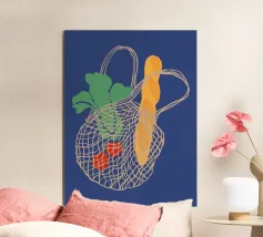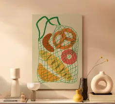 Una natura morta vivace e stravagante con succosi cachi annidati in un sacchetto di rete color menta, su strisce verdi di ispirazione vintage. Questo audace pezzo pop-art dà un tocco di freschezza alle pareti della cucina, agli angoli della galleria o al vostro angolino preferito. Un delizioso cenno alla vita lenta e al fascino retrò.