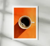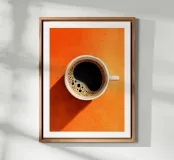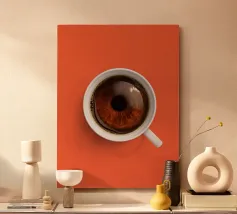 Una tazza di caffè nero con una ricca crema e bollicine, vista dall'alto, proietta una lunga ombra su un vibrante sfondo arancione. Le linee pulite e la texture pittorica creano un look minimalista di grande effetto che dà energia alle cucine, ai bar e agli angoli per la colazione. Uno stile grafico moderno che si abbina perfettamente all'arredamento contemporaneo.
