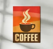Questo poster nostalgico celebra il caffè con le immagini iconiche degli anni Settanta. Le sfumature di colore orizzontali nei toni del rosso, dell'arancione e del giallo ricordano l'estetica del viale del tramonto e le classiche insegne dei diner statunitensi. Le nuvole di vapore stilizzate e la chiara silhouette della tazza mostrano influenze dell'art déco e del design grafico di metà secolo. L'audace tipografia nella parte inferiore conferisce al pezzo un carattere sorprendente. Il perfetto equilibrio tra arte decorativa e design funzionale. Un must per gli amanti del vintage e del caffè, per le caffetterie e le cucine.
