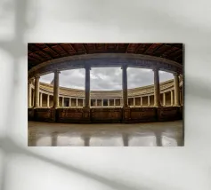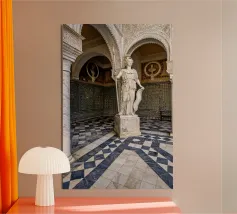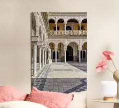 L'immagine mostra un interno storico della Casa de Pilatos di Siviglia, un palazzo del XVI secolo con influenze architettoniche mudéjar, gotiche e rinascimentali. Le pareti sono completamente ricoperte da piastrelle decorate con motivi geometrici e floreali nei toni del blu, del verde e del marrone. Queste piastrelle sono tipiche dell'arte mudéjar e riflettono la diversità culturale dell'Andalusia. Il soffitto è costituito da pannelli in legno dorato con complessi ornamenti e rilievi che documentano la maestria dell'epoca.