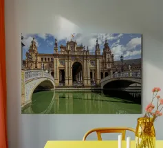 L'immagine mostra un interno storico della Casa de Pilatos di Siviglia, un palazzo del XVI secolo con influenze architettoniche mudéjar, gotiche e rinascimentali. Le pareti sono completamente ricoperte da piastrelle decorate con motivi geometrici e floreali nei toni del blu, del verde e del marrone. Queste piastrelle sono tipiche dell'arte mudéjar e riflettono la diversità culturale dell'Andalusia. Il soffitto è costituito da pannelli in legno dorato con complessi ornamenti e rilievi che documentano la maestria dell'epoca.