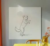 Cane giocoso in piedi su due zampe in un semplice artistico alluminio dibond