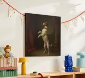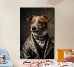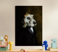 Cane in piedi sulle zampe posteriori in un classico studio di posa alluminio dibond