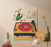 Un'illustrazione allegramente caotica ed espressiva che celebra la nostalgia e la musica. Un audace giradischi portatile, con una base a scacchi bianchi e arancioni e un coperchio verde intenso, è il pezzo forte. Il disco in vinile rosso è caratterizzato da linee bianche astratte e vorticose che trasmettono il suono e il movimento. Intorno al lettore, fiori rosa disegnati a mano, cuori rossi e note musicali fluttuano su uno sfondo giallo chiaro, suggerendo un'atmosfera stravagante da canzone d'amore. Lo stile è quello del massimalismo dell'arte popolare che incontra l'estetica retro groovy. Questo pezzo è ideale per aggiungere un'esplosione di Dopamina Decor e personalità. Il pr