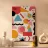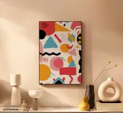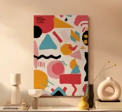 Una composizione astratta caotica e divertente in stile Memphis, con un assortimento casuale di forme geometriche, ghirigori e motivi. L'opera d'arte è energica, giocosa e ha una fresca atmosfera retrò.