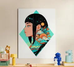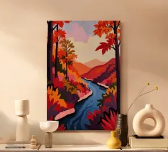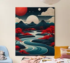 Si apre un paesaggio ipnotico, dove cime imponenti trafiggono un cielo pieno di sfere di luce. La scena è un tripudio di colori, con sfumature di arancio, rosa, blu e viola che si fondono senza soluzione di continuità. L'uso di linee spigolose e taglienti accostate a forme morbide e arrotondate crea una tensione visiva accattivante. Un fiume tranquillo si snoda nella valle, riflettendo i colori vibranti che la sovrastano. Quest'opera invita lo spettatore a esplorare un mondo in cui colore e forma danzano in perfetta armonia.