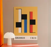 Un esempio lampante dell'iconico movimento Bauhaus, questa stampa geometrica astratta presenta una composizione equilibrata di blocchi rettangolari verticali e orizzontali. Il disegno utilizza la classica palette di colori primari del rosso e del blu, in contrasto con il bianco e il nero, il tutto su uno sfondo giallo ocra caldo. L'estetica cattura l'essenza del modernismo dei primi del Novecento ed è perfetta per un interno minimalista o moderno di metà secolo. Questo poster digitale di alta qualità viene fornito con una risoluzione superiore di 7000x5000 pixel e 300 dpi, assicurando un'eccellente chiarezza e colori vibranti per tutti i vostri
