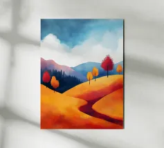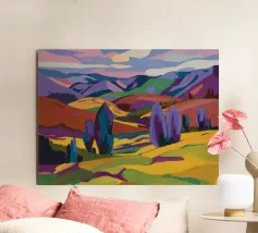 Morbide colline ondulate mostrano ricche sfumature di rosa, arancione e blu, mentre un cielo vibrante pieno di soffici nuvole esalta l'atmosfera tranquilla. Piccoli alberi punteggiano il paesaggio.