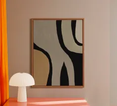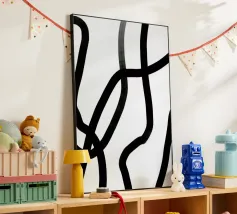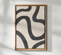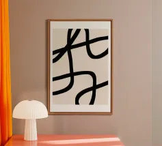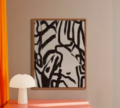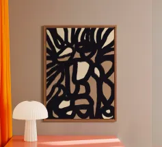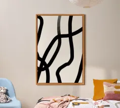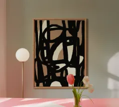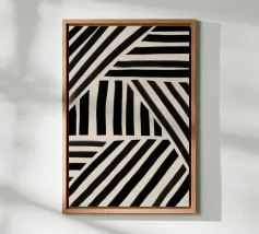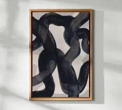 Una potente rete di linee nere che si piegano e si intersecano, come flussi di pensiero contrastanti su uno sfondo neutro. La composizione ricorda l'astrazione gestuale, con echi di Franz Kline e dell'arte dell'inchiostro giapponese. Nonostante l'austerità della tavolozza dei colori, si sviluppa una dinamica espressiva. Un'opera che trae tensione dalla riduzione e carica lo spazio di pura energia visiva. Anche su tessuti.
