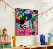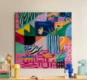 Un collage vibrante e caotico di motivi contrastanti, tra cui righe, pois e forme organiche. La gioiosa esplosione di colori e texture crea un'opera d'arte energica e piena di vita.