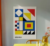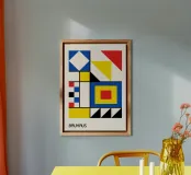 Un vibrante manifesto astratto di ispirazione Bauhaus e De Stijl, che presenta un'armoniosa disposizione di forme geometriche in colori primari (rosso, giallo, blu) completati dal bianco e dal nero. Il disegno presenta una complessa griglia di quadrati e rettangoli, alcuni dei quali contengono colori solidi, altri motivi intricati come una scacchiera o un diamante ruotato. Questo pezzo sorprendente esemplifica la precisione e l'equilibrio caratteristici del movimento artistico modernista. Perfetto per aggiungere un tocco artistico e sofisticato a qualsiasi spazio contemporaneo. Questo poster digitale offre una superba risoluzione di 7000x5000 pixel a 300 dpi.