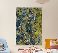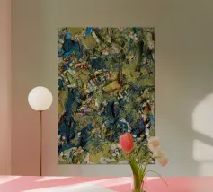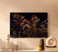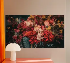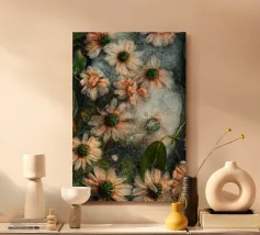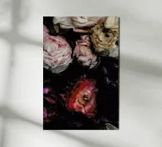 Quest'opera d'arte presenta una composizione di piante secche ed elementi floreali disposti ad arte che combinano naturalezza ed estetica. Tre fiori bianchi sono al centro della scena, la loro forma elegante e la loro consistenza fine ricordano la porcellana. Appaiono come protagonisti silenziosi in un ricco insieme di materiali essiccati, tra cui foglie delicate, teste di semi e capsule di frutta nelle calde tonalità del marrone, del verde e del blu.