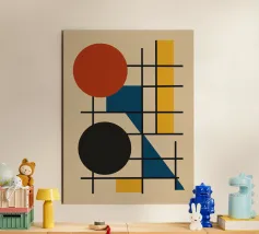 Un dinamico poster astratto Bauhaus che celebra la geometria pura e i colori primari. Il disegno integra magistralmente rettangoli rossi, cerchi gialli e blu e audaci linee nere in una composizione di grande impatto. Gli elementi includono un grande quadrato rosso sovrapposto a un cerchio nero parziale, un cerchio giallo pieno e barre nere verticali che creano tensione visiva. Questo pezzo racchiude magnificamente lo spirito modernista e costruttivista. Questo poster digitale viene fornito con una risoluzione superiore di 7000x5000 pixel a 300 dpi, assicurando una qualità di stampa eccezionale per una dichiarazione audace nei vostri interni moderni.