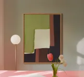 L'immagine presenta forme rettangolari sovrapposte nei toni terrosi del verde, del beige, del marrone e del nero. La composizione è minimalista ed evoca un senso di equilibrio.