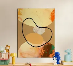 Un design minimalista presenta una linea nera continua che si intreccia con forme geometriche colorate, tra cui grandi cerchi di varie tonalità. Lo sfondo è un colore morbido e neutro che mette in risalto l'audacia degli elementi astratti.