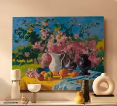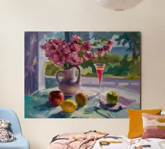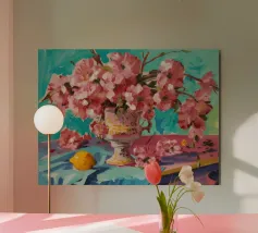 Un'audace natura morta con vivaci fiori rosso-rosa, forse papaveri o gerani, in un semplice vaso, accanto a fresche pere verdi, il tutto su una ricca tovaglia rossa che contrasta nettamente con uno sfondo blu intenso.