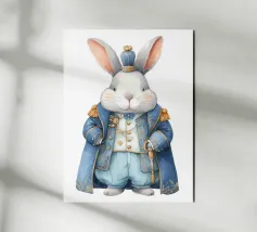 Un coniglio stravagante in plaid si muove con decisione, stringendo una lettera con urgenza surreale.