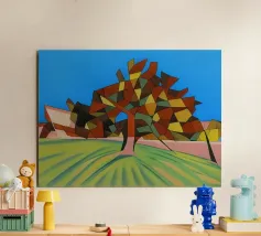 Un paesaggio geometrico cubista con un vivace albero di limoni in cima a dolci colline. In lontananza, un piccolo gatto riposa pacificamente, aggiungendo un tocco stravagante a questa composizione audace e colorata.