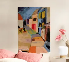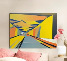 Un sentiero giallo brillante si snoda elegantemente attraverso un paesaggio minimalista di edifici grigi e squadrati. Il dipinto è uno studio sul contrasto dei colori e sulle forme geometriche pulite, che creano una scena urbana serena ma di grande impatto visivo.