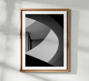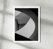Poster in bianco e nero di architettura minimalista: curve organiche e spigoli vivi fotografati sotto una scala a chiocciola, vicino a una finestra. Il contrasto tra aree chiare e ombre profonde scolpisce una composizione fluida, geometrica e senza tempo, con delicate texture di stucco. Un elegante poster da parete che porta movimento, calma e modernità in salotto, camera da letto o ufficio, in stile contemporaneo, scandinavo, japandi o wabi-sabi.