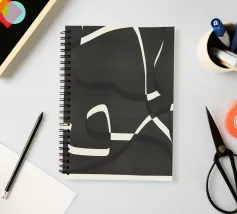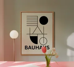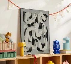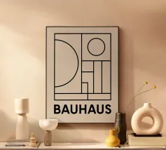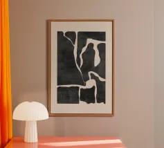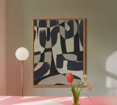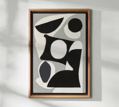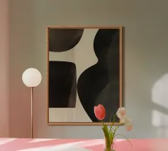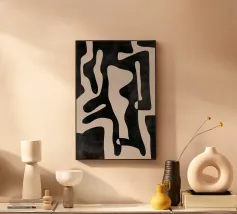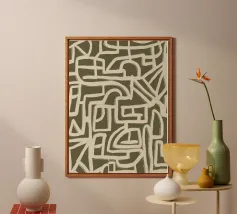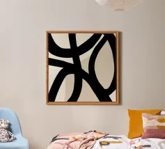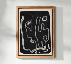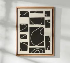 Una composizione astratta caratterizzata dalla sovrapposizione di curve e linee nere su uno sfondo beige. Il disegno gioca con i contrasti e le forme geometriche per creare un equilibrio tra movimento e immobilità.