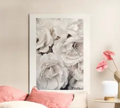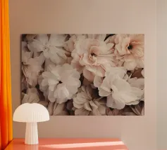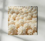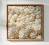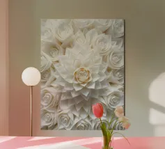 Questa splendida immagine cattura un sereno e intricato campo di fiori ritagliati in carta, che assomiglia a un mare di dalie bianche luminescenti. Ogni fiore è stato meticolosamente realizzato con più strati, creando un senso di profondità e delicata consistenza. Le morbide tonalità crema e bianco sporco, immerse in una luce delicata, evocano una sensazione di purezza, tranquillità e raffinata eleganza. Questo pezzo è perfetto per chi apprezza l'artigianato dettagliato e un'estetica pulita e minimalista. Sarebbe una splendida aggiunta a un arredamento moderno, scandinavo o shabby chic, aggiungendo un tocco di sofisticata arte floreale a qualsiasi spa.