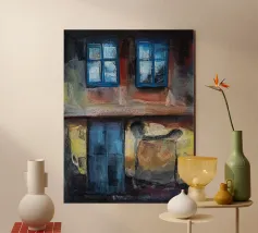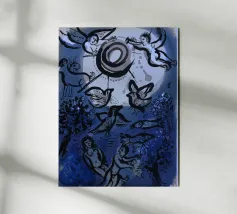 Questa litografia di Marc Chagall illustra una scena biblica, probabilmente raffigurante il re Davide che fugge da una finestra mentre la moglie Michal fa la guardia. Eseguita nella caratteristica tavolozza blu, grigia e bianca di Chagall, cattura un momento di dramma, lealtà e passione. Le figure sognanti e fluttuanti e la semplice ambientazione architettonica trasmettono una narrazione emotiva e senza tempo.