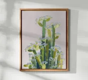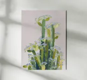 Questa delicata opera d'arte raffigura cactus verdi con fiori azzurri, dipinti in tenui colori pastello. La combinazione di toni morbidi di beige e verde conferisce al motivo un'atmosfera calda e naturale. Ispirato alla botanica del deserto, il risultato è un quadro vegetale minimalista con una leggerezza estiva.