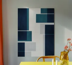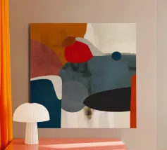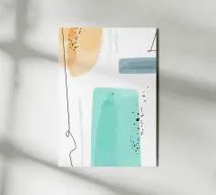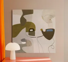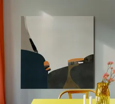 Opera d'arte astratta minimalista con una tavolozza di colori serena ed elegante: le morbide tonalità pastello come il verde turchese chiaro e il beige creano un'atmosfera rilassante, mentre il contrasto con il grigio scuro e l'arancione brillante aggiunge profondità e vivacità. Questa combinazione offre un'estetica minimalista e astratta con un tocco di raffinatezza. È un equilibrio di calma e interesse visivo, perfetto per creare uno spazio tranquillo ma visivamente accattivante.