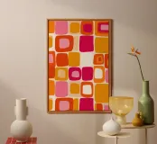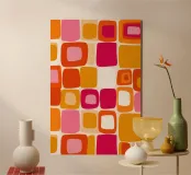 Questo disegno astratto è un omaggio esplosivo allo stile moderno della metà del secolo scorso e all'energia sfrenata della pop art. Rettangoli e quadrati arrotondati danzano in una tavolozza di colori caldi come l'arancio brillante, il fucsia, il rosso intenso e il pesca tenue. La composizione irradia un ottimismo quasi psichedelico, ma perfettamente equilibrato, grazie alla sua giocosità geometrica e alla stratificazione delle forme. Un capolavoro che diffonde immediatamente gioia, ravviva l'ambiente e celebra l'estetica degli anni '60 e '70 con una freschezza senza tempo.