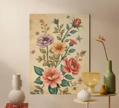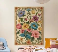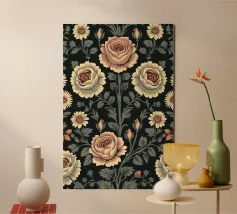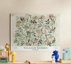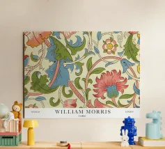 Questa raffinata opera d'arte di William Morris presenta un motivo floreale nei toni tenui dell'oro, del beige, del rosa e dell'arancio che celebra la bellezza senza tempo della natura. Con il suo stile distintivo e l'elegante tipografia, incarna la fusione di arte e design che Morris ha reso popolare in epoca vittoriana.