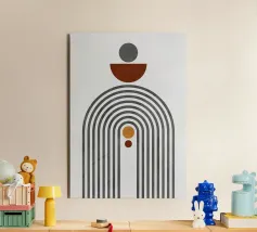 Questo design colpisce per l'armonia degli archi e per la palette di colori caldi e terrosi in marrone, nero e arancione. Le linee geometriche pulite e il sottile tocco vintage lo rendono un'attrazione senza tempo per qualsiasi casa moderna o nostalgica. Perfetto per l'arte da parete, i cuscini o gli accessori per la casa, per dare alla vostra stanza uno stile elegante e unico.