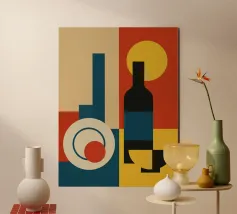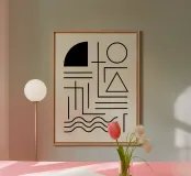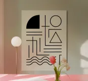 Una disposizione astratta di forme geometriche su sfondo beige, con semicerchi, linee e triangoli. Il design è semplice ma audace, con contorni neri che creano un contrasto sorprendente.