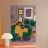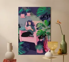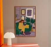 Una donna si accoccola su un divano verde, immersa in un libro e con una tazza di tè vicino. La stanza è decorata con piante e opere d'arte, creando una scena perfetta di confortevole solitudine e fuga intellettuale.