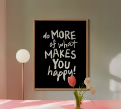 Questo design d'ispirazione presenta lo slogan motivazionale "FAI DI PIÙ QUELLO CHE TI RENDE FELICE" in caratteri maiuscoli neri su sfondo bianco. Il messaggio chiaro e potente è un promemoria quotidiano per concentrarsi sulle cose che portano gioia e soddisfazione. Il design minimalista permette al testo di essere al centro dell'attenzione e di enfatizzare il significato delle parole.
