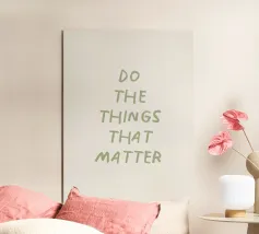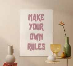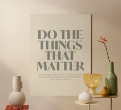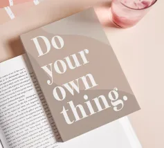 Una composizione vibrante ed edificante con una persona che cammina con sicurezza lungo un sentiero tortuoso e colorato che si separa da una strada trafficata e uniforme. La frase "Do Your Own Thing" (Fai la tua cosa) è stilizzata in una tipografia audace e dipinta a mano, circondata da spruzzi di colore. Le opere d'arte emanano individualità, libertà e autoespressione.