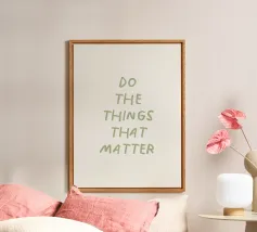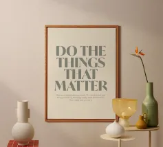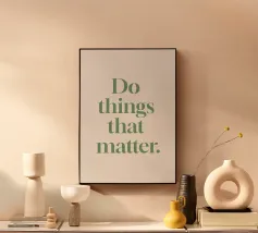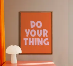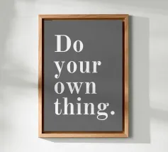 Una composizione vibrante ed edificante con una persona che cammina con sicurezza lungo un sentiero tortuoso e colorato che si separa da una strada trafficata e uniforme. La frase "Do Your Own Thing" (Fai la tua cosa) è stilizzata in una tipografia audace e dipinta a mano, circondata da spruzzi di colore. Le opere d'arte emanano individualità, libertà e autoespressione.