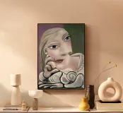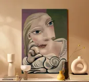 Immergetevi nello sguardo intrigante di questo poster digitale, un irresistibile omaggio ai ritratti cubisti di Picasso. L'opera d'arte presenta un volto di donna, in posa pensierosa con la mano sul mento, reso con tratti frammentati e una tavolozza morbida di blu, rosa e crema. Gli occhi blu espressivi e il sorriso sottile attirano l'osservatore nel suo stato contemplativo, mostrando le molteplici prospettive caratteristiche dell'approccio rivoluzionario di Picasso. Questo poster digitale di qualità superiore, che vanta 7000x5000 pixel a 300 dpi, cattura in modo impeccabile le sfumature di colore e lo stile innovativo, rendendolo uno dei più importanti dipinti di Picasso.