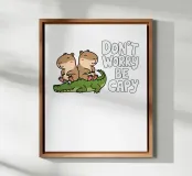 Due simpatici capibara siedono pacificamente su un coccodrillo verde, con accanto la frase scherzosa "Don't Worry Be Capy".