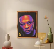 Primo piano del volto intenso di un uomo, luminoso nei toni del blu e dell'arancio, con la scritta "DR. DRE"