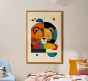 Un pacifico cucciolo di leone sonnecchia sotto un cielo di ispirazione Bauhaus, avvolto da vivaci blocchi di rosso, blu, giallo e arancione. Questa composizione audace ma serena è un ponte tra il mondo del design astratto e la dolcezza delle emozioni, ed è un pezzo perfetto per le camerette, le stanze da gioco o gli spazi per bambini dal design ricercato.