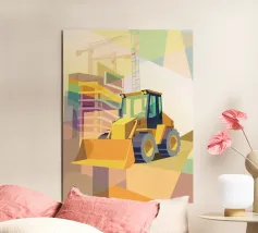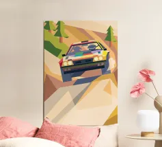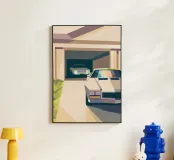 Illustrazione di due auto in un garage con uno stile geometrico moderno.