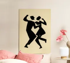 Due figure astratte disegnate in nero sono affiancate, collegate da una linea sottile. Minimalista e in netto contrasto su uno sfondo chiaro, la composizione trasmette vicinanza, equilibrio e una comunicazione silenziosa tra le forme.