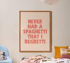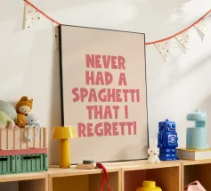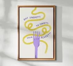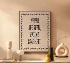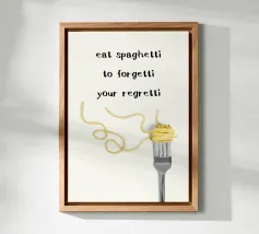 Questa divertente stampa con citazione "Mangia gli spaghetti per dimenticare i tuoi rimpianti" è una gradita aggiunta a qualsiasi cucina o sala da pranzo.